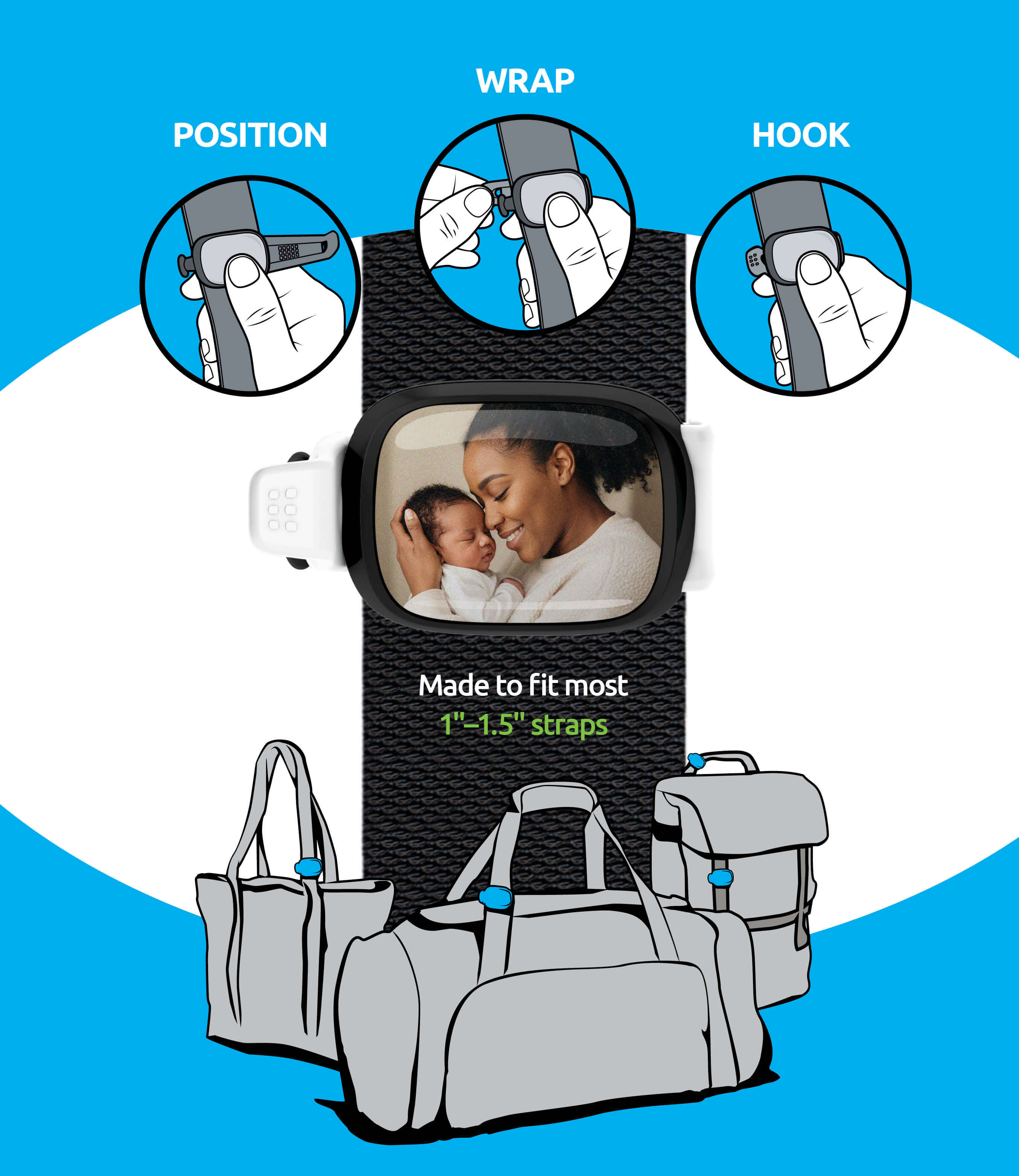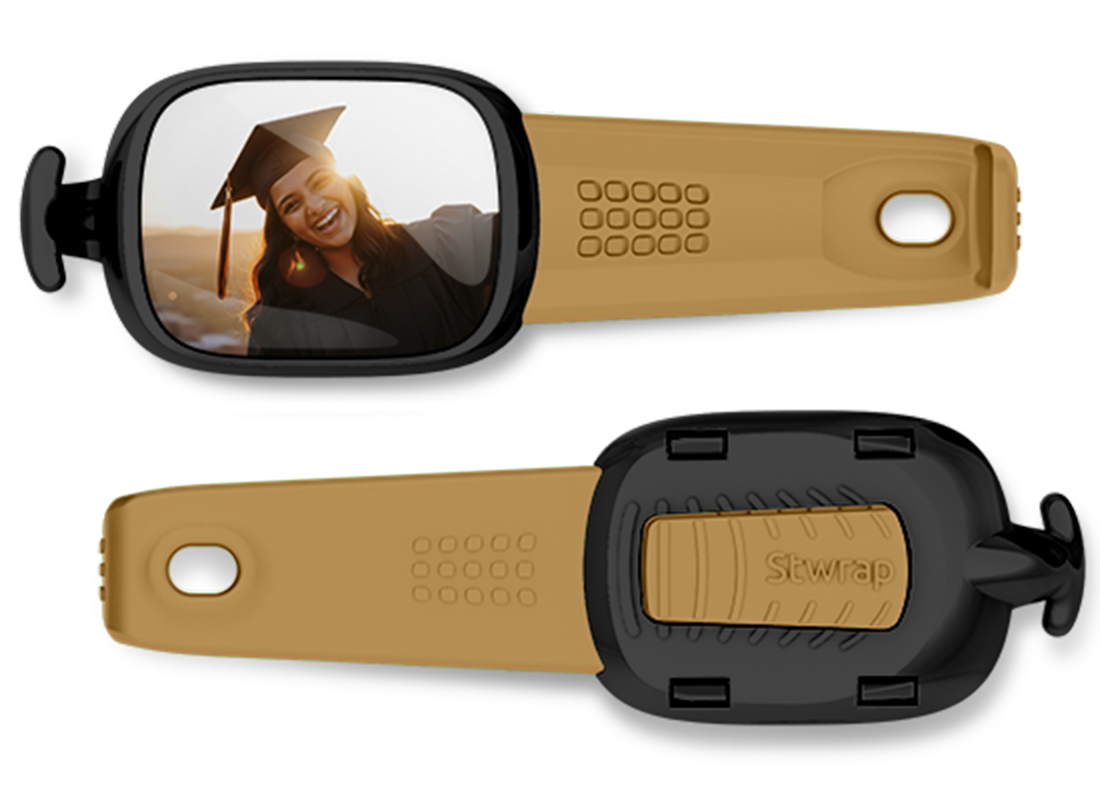 A Stwrap is a customizable keepsake you wear on your bag, backpack, or everyday carry. Each one holds a photo, message, or symbol that’s personal to you, a memory, a milestone, a reminder. Built with a patented design that fits most bag straps (1"–1.5"), Stwraps are easy to attach, easy to swap, and made to move with you as part of your everyday life.